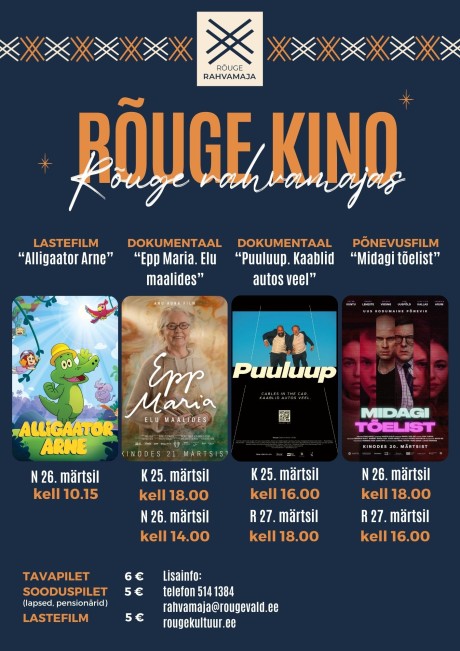 Märtsikuu kinopäevad toimuvad Rõuge rahvamajas 25.-27. märtsini. Näidatakse nii krimifilmi, dokumentaale kui ja animatsiooni.
