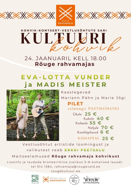 Sel hooajal on Rõuge rahvamajas plaanis veel kaks kultuurikohvikut. Järgmine neist toimub 24. jaanuaril, mil peakülaliseks on Võrumaal tegutsevad Eva-Lotta Vunder ja Madis Meister, kelle loomingulist teekonda hakkame vestluse kaudu sündmuse esimeses pooles avama. Koos nendega astuvad üles ka Mariann Pähn ja Marie Jõgi.