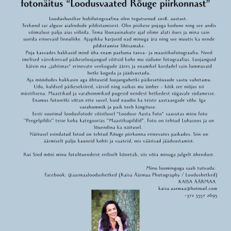 Kaisa Äärmaa on loodushuvilise hobifotograafina tegutsenud 2018. aastast. See teekond sai alguse aialindude pildistamisest ajal, mil Kaisa Äärmaa oli pisikese pojaga kodune ning oli võimalus palju aias viibida. Poja kasvades hakkasid teda aga üha enam paeluma taeva- ja maastikufotograafia, jahtides nii loojanguid erinevate veekogude ääres kui ka uduseid kuldsete päikesekiirte, värvide ning vaikusega päikesetõuse. Enamus fotoretki võtab Äärmaa ette suvel, kuid naudib seejuures ka teiste aastaaegade võlu. Iga varahommik ja paik teeb kingituse.