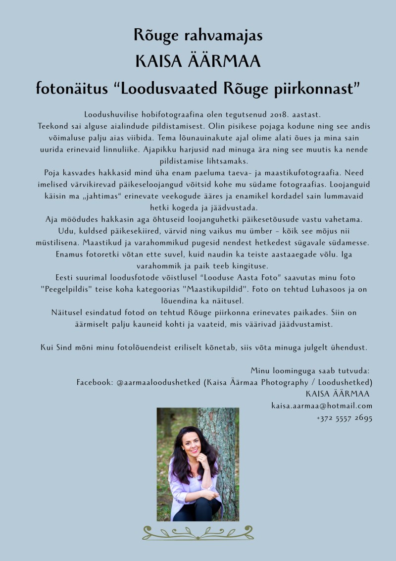 Lisainfo: rahvamaja@rougevald.ee või telefon 514 1384.