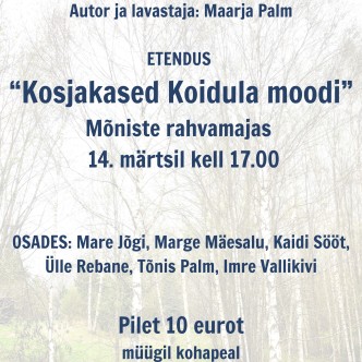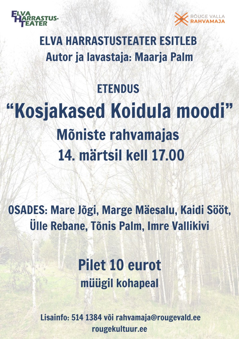 Laupäeval, 14. märtsil kell 17.00 annab Elva harrastusteater Mõniste rahvamajas etenduse "Kosjakased Koidula moodi".